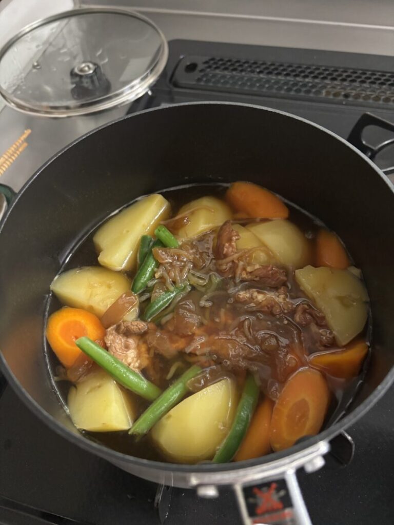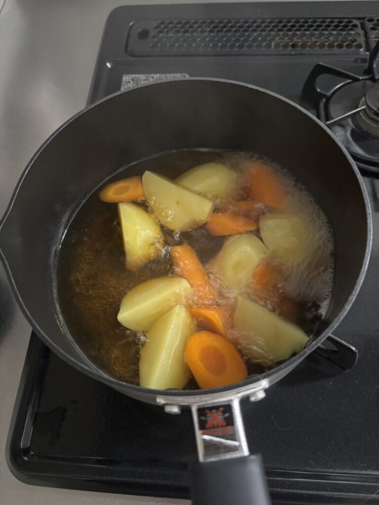 お手軽肉じゃが koharu 今回使うのは、コチラのレトルト😊 さらに冷凍のインゲンも使っちゃう 皮をむいてアク抜きしたジャガイモとニンジンを耐熱容器に入れ、野菜がかぶるくらいの水を入れて500Wで6分程レンチンする 茹で汁と共に鍋に移し、麺つゆ大さじ2、みりん大さじ2を入れて煮込む(味付けについては、好みで醤油や調理酒、顆粒だしなどを加えるのもありですが、あまり濃くならないよう味見しながら加減してください) ジャガイモとニンジンが柔らかくなったら、インゲンと牛丼のレトルトを投入! 肉じゃがの完成✨ 【使用するレトルトについて】 今回は生協で買ったグリコの「DONBURI亭」を使いましたが・・・ハッキリ言って肉が少ない! 通常なら1袋で済むところ2袋使っちゃいました💦 やっぱり「吉野家」とか「すき家」のレトルトがオススメです👍 2025年8月15日 投稿先 レトルト研究会(2025) ← 過去の投稿へ 次の投稿へ → コメントを残す コメントをキャンセルメールアドレスが公開されることはありません。 ※ が付いている欄は必須項目ですコメント ※ 名前 メール サイト Δ
