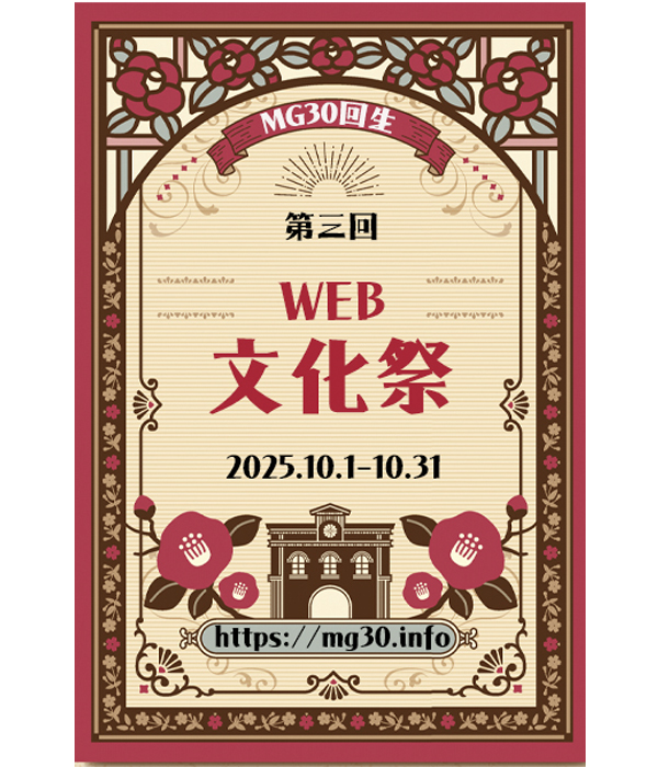 MG30文化祭・2025 ・ART部 ・写真部 ・花俱楽部 ・映画部 ・ミニチュア同好会 ・手芸部 ・食べ歩き同好会 ・アニメ&コミック研究会 ・エンタメ&イベント情報俱楽部 ・美味しいもの作り研究会 ・旅俱楽部 ・レトルト研究会 ・アニマル俱楽部 ・ホラーハウス